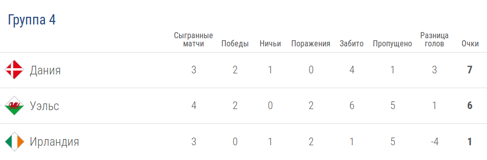 Датская сборная попала в группу к двум командам с британских островов, одна из которых на прошлом чемпионате Европы дошла до полуфинала, но как раз эту самую команду — сборную Уэльса под руководством Райана Гиггза она и обыграла, причём дважды, что позволило ребятам Оге Харейде вдобавок к одному очку после визита в столицу Ирландии набрать в сумме семь очков и за три дня до окончания шестого тура выйти в плей-офф.