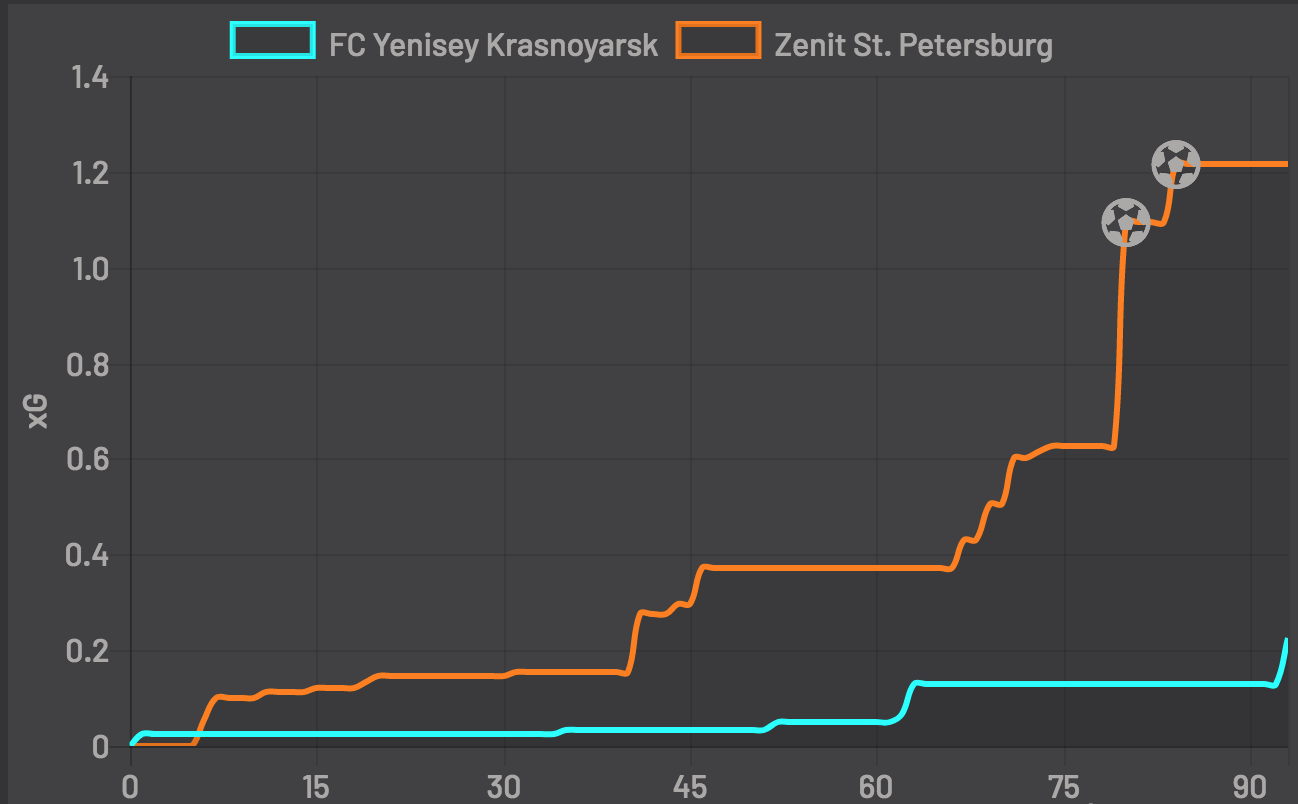 Как можно увидеть на графике выше, «Зенит» практически ничего не позволил создать у своих ворот. Сам же играл значительно острее. xG «Зенита» достиг 1,22. Но в первом тайме в созидании были определенные сложности.