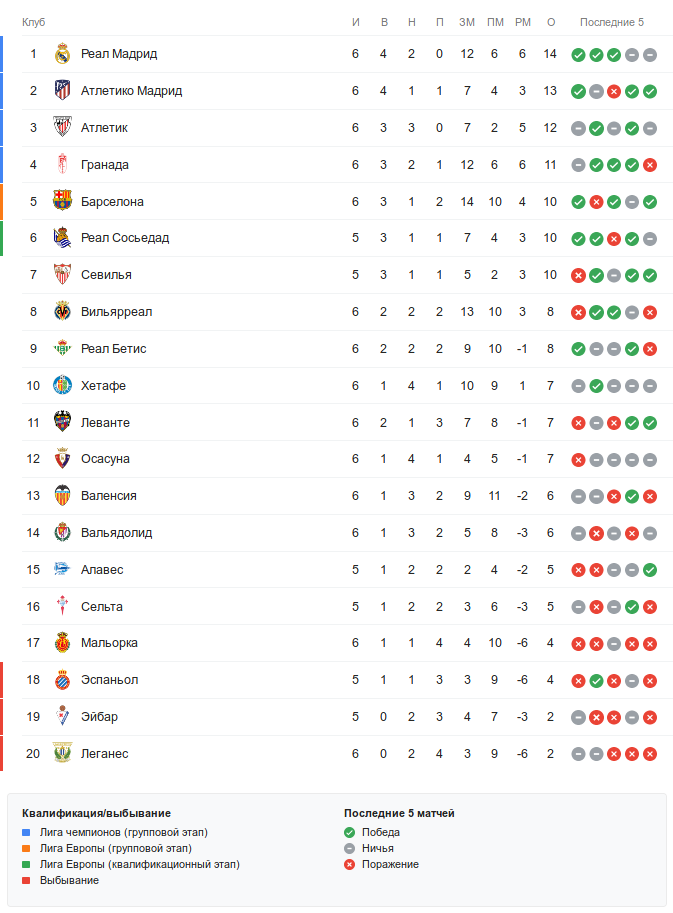 После завершения вторничных матчей и поединков среды андалузская команда занимает 7-е место в турнирной таблице Ла Лиги, но может закончить 6-й тур на 3-й строчке или даже разделить 2-е место с мадридским «Атлетико».