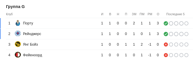 «Фейеноорд» занял 3-е место в таблице после домашнего поражения от шотландского «Рейнджерса» со счётом 1:2 — швейцарские «Янг Бойз» оказались ниже только потому, что пропустили на своём поле 2 гола от «Порту», хотя имеют такую же разницу забитых и пропущенных мячей, как и «Фейеноорд»: −1.