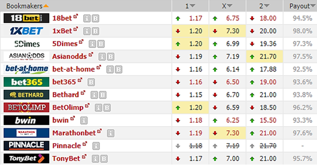 В БК 1xbet коэффициент на П1 упал с 1.42 до 1.20.