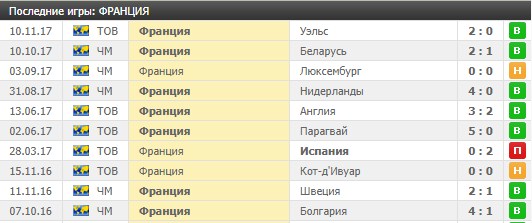 Здесь представлено, как французы играли у себя дома. И вот в глаза бросаются 2 матча, сыгранных вничью, и проигрыш в товарищеском поединке со сборной Испании. Но стоит учитывать, что игры с Кот-д’Ивуар и Люксембургом проходили на других полях, а проигрыш Испании случился на «Стад де Франс». Во всех остальных случаях были показаны блестящие результаты.
