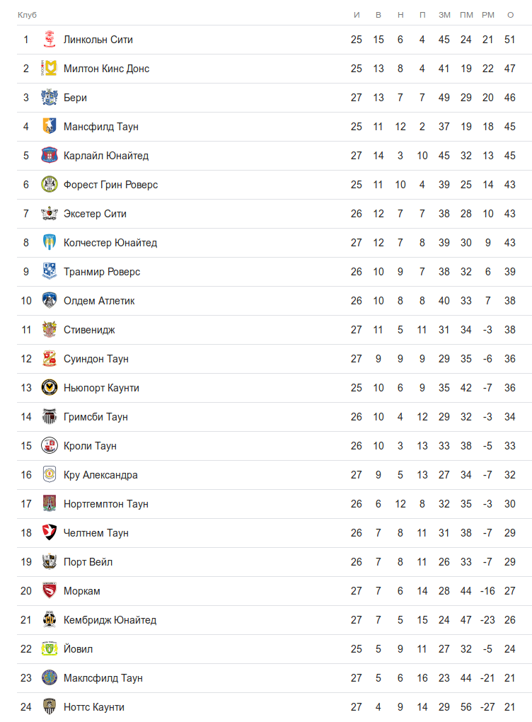 Таблица второй английской лиги после первой группы матчей двадцать седьмого тура: