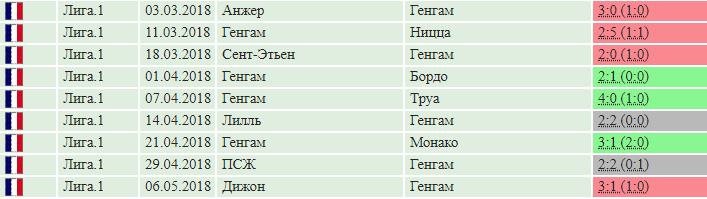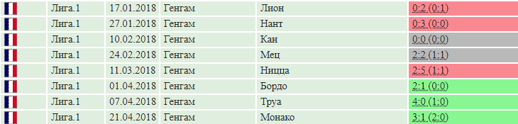 По этим результатам мы видим, что «Генгам» не показывает стабильную игру у себя дома, этой команде свойственны частые осечки, но в крайних трех домашних турах было добыто три виктории подряд. И особое внимание стоит уделить домашней виктории над «Монако», которая была добыта со счетом 3:1. Но только здесь надо учитывать, что «монегаски» с 21-ой минуты играли в меньшинстве, к тому же пропустив на 22-ой минуте гол с пенальти, что и сыграло свою роль.