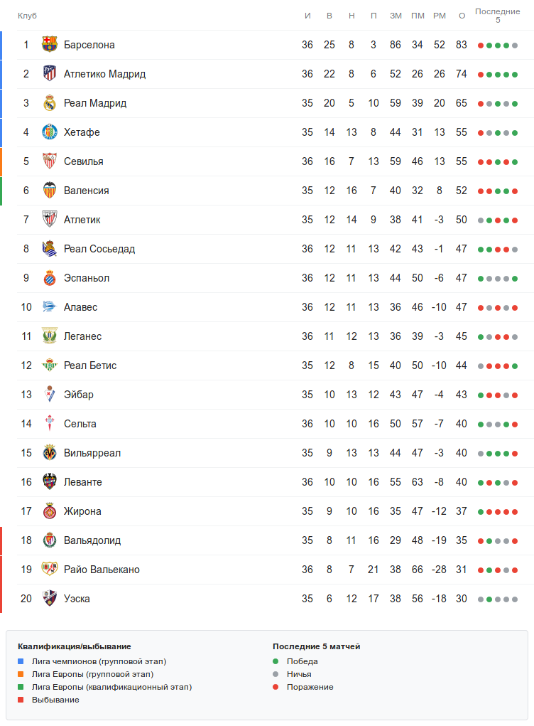 Возможно, интрига в нижней тройке таблицы продержится до последнего тура, поскольку «Вальядолид» отстаёт от «Жироны» всего на 2 очка, тоже ещё не сыграл свой 36-й матч сезона и к тому же набрал больше очков в очных встречах.