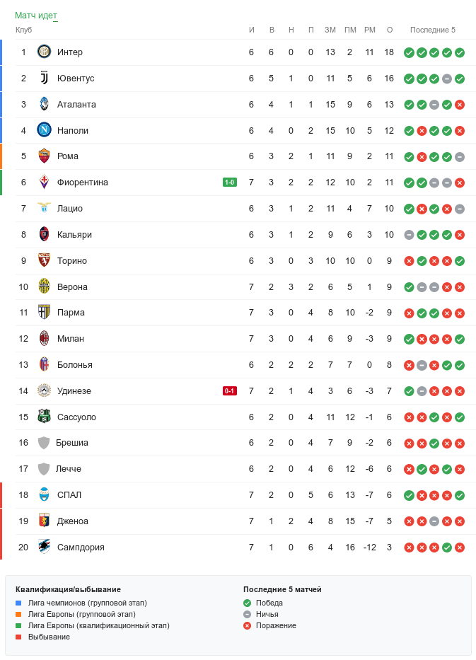 Миланскую команду заочно считали главным конкурентом «Ювентуса» после того, как тренировать её пригласили Антонио Конте. Пока что ожидания оправдаются: хозяева поля заработали максимальные 18 очков в 6-и матчах и занимают первое место в турнирной таблице, опережая «Ювентус» на 2 очка.