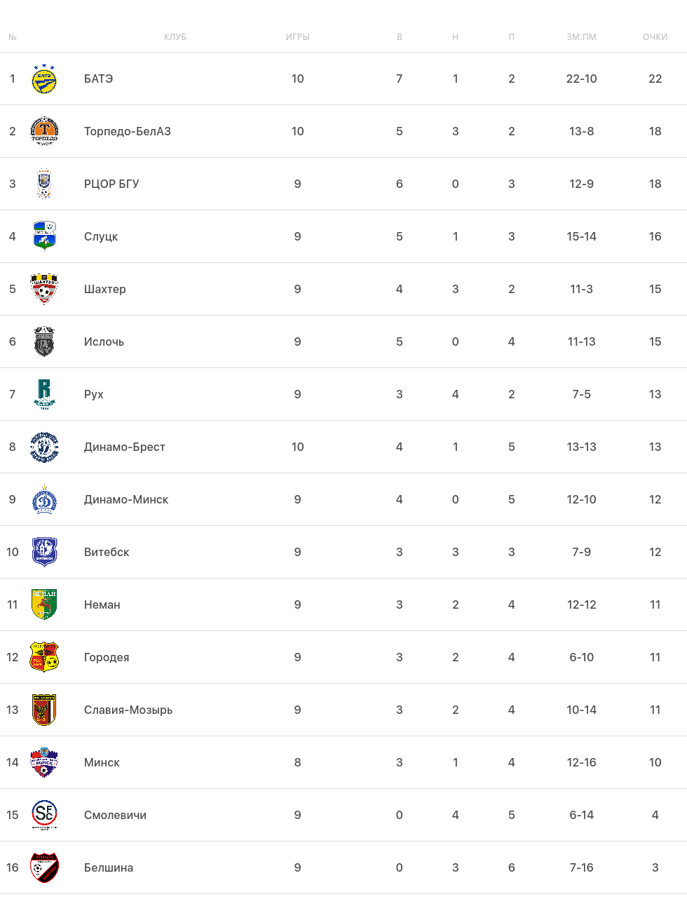 Перед пятничными матчами команда, представляющая Минский район, занимает 6-е место в турнирной таблице и не сдвинется оттуда, как бы ни закончились поединки в последний рабочий день — «Шахтёр Солигорск» заработал столько же очков, но не опустится ниже 5-й строчки.