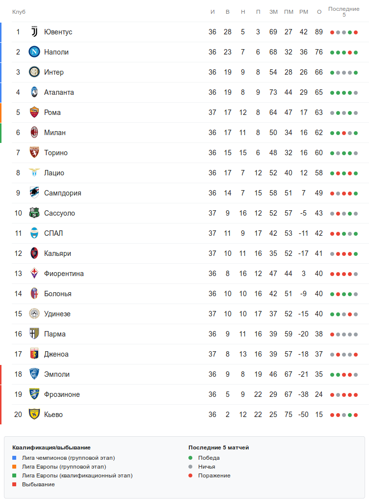 Пока что «Аталанта» идёт 4-й отстаёт от «Интера» на одно очко, но ранняя победа «Милана» над «Фрозиноне» может сдвинуть её на 5-ю строчку из-за большего числа очков в очных встречах между «Аталантой» и «Миланом».