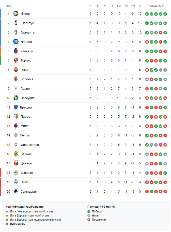 Перед началом 6-го тура «Ювентус» занимает 2-е место в турнирной таблице Серии А с 13-ю заработанными очками из 15-и возможных — их все и набрал «Интер». Однако больше впечатляет не разница очков туринской и миланской команд, а разница забитых и пропущенных ими голов: если у одной это +4, то у другой +9.