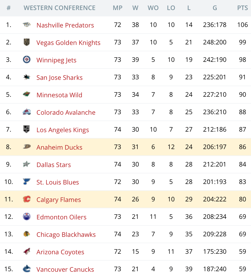 Как можно увидеть в таблице конференции, Калгари отстает от топ-8 на 6 очков. При этом Калгари еще и сыграл на один матч больше. Огонькам в регулярном первенстве осталось сыграть 8 матчей. Следовательно они могут набрать 96 очков максимум. В прошлом сезоне Калгари и Нэшвиллу хватило 94 очка, чтобы с 7-8 мест Западной конференции квалифицироваться в плей-офф. На Востоке это значение было выше и Бостону и Торонто понадобилось набрать по 95 очков, чтобы с 7-го и 8-го места пройти в плей-офф.