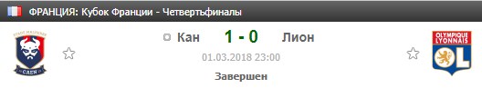 А ведь это один из претендентов на медали чемпионата. И не это самое главное. Кан выбил из кубка Лион 1 марта, а уже 11 марта приехал в гости к этому коллективу в рамках внутреннего первенства. Казалось, что Лион сейчас поврет столь наглого середняка, а сумел выиграть только со счетом 1:0.