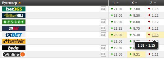 Четко видно, как в букмекерской конторе 1xbet первоначально коэффициент на победу гостей стоял 1.38, а в итоге стал 1.15. Это очень большое падение.