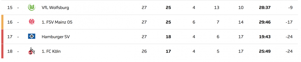 Кельн отчаянно нуждается в очках и большой удаче, чтобы сохранить прописку в Бундеслиге 1 на следующий сезон. Отставание от спасительного 15-го места составляет 8 очков, а сыграть осталось 7 матчей. Команда, занявшая 16-е место сыграет с 3-й командой Бундеслиги 2 за еще одну путевку в элитный дивизион немецкого футбола. Но до 16-го места Кельну также 8 очков.