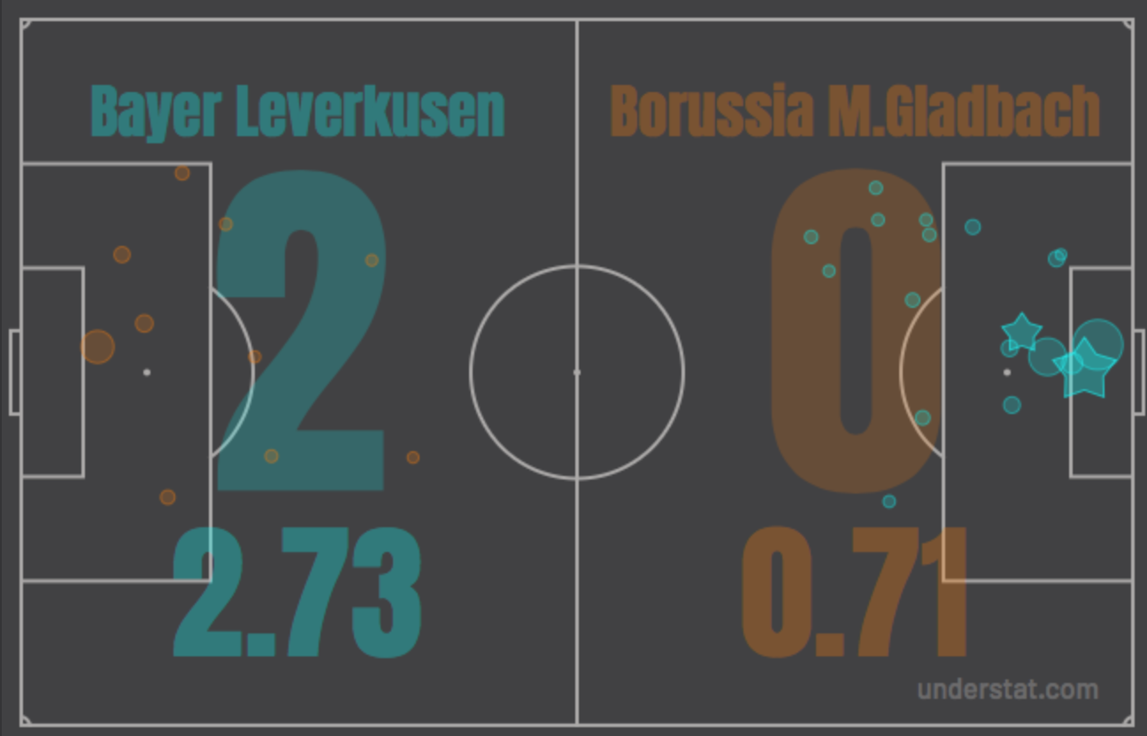 И посмотрите насколько мощно Байер сыграл в атаке в прошлом туре против менхенгладбахской Боруссии. Забили 2, но вполне могли забить и больше. 10 опасных ударов из пределов штрафной и высокий xG (2,73).