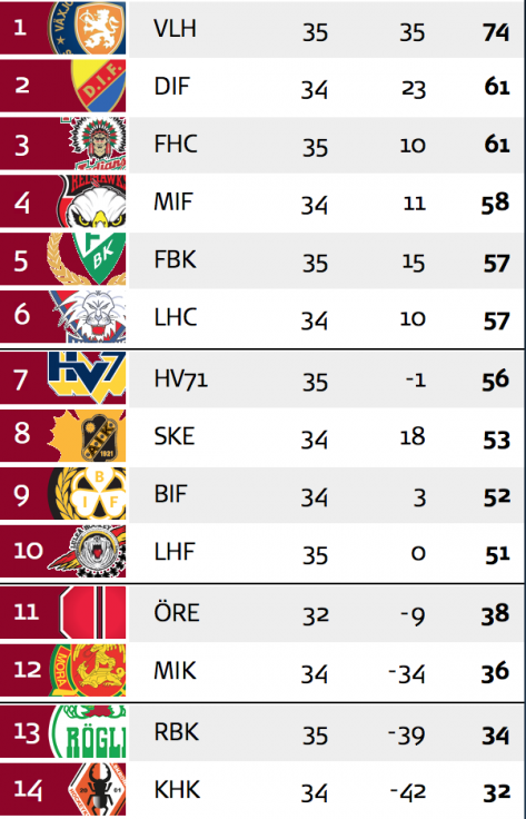 Регле и Карлскруна, конечно, будут стараться достать Мору с Эребру и миновать стадию плей-аут. А 13-е и 14-е места будут играть с лучшими командами плей-аут, в котором определится кто в пойдет в SHL, кто в Аллсвенскан.