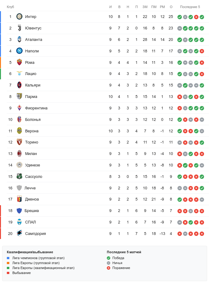 3 тура назад «Интер» проиграл в очной встрече с «Ювентусом» — это же раньше сделал и «Наполи» — и позволил чемпиону Италии обойти себя, но снова вышел вперёд во вторник. «Наполи» же весь новый сезон не отличался стабильностью выступлений, из-за чего заработал 17 очков из 27 возможных.
