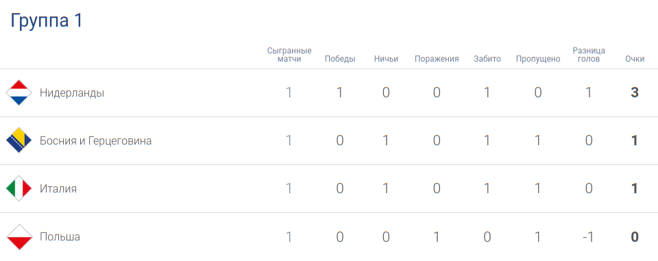 Нидерландская сборная закончила первый тур победой над поляками со счётом 1:0. Этот результат позволил ей занять первое место в турнирной таблице, потому что итальянцы сыграли дома вничью 1:1 с боснийцами.