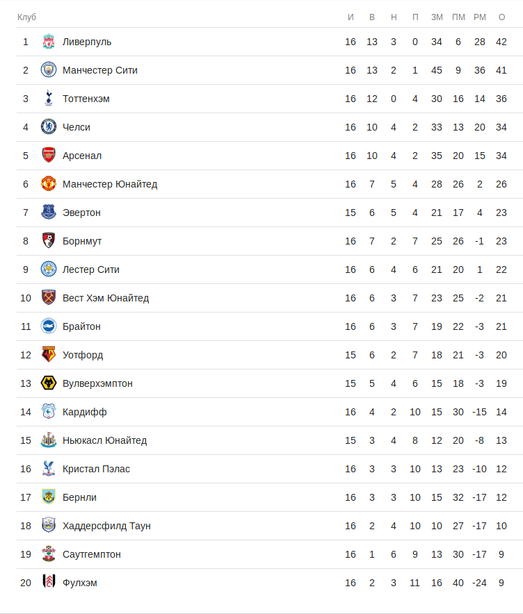Турнирная таблица премьер-лиги после субботних матчей: