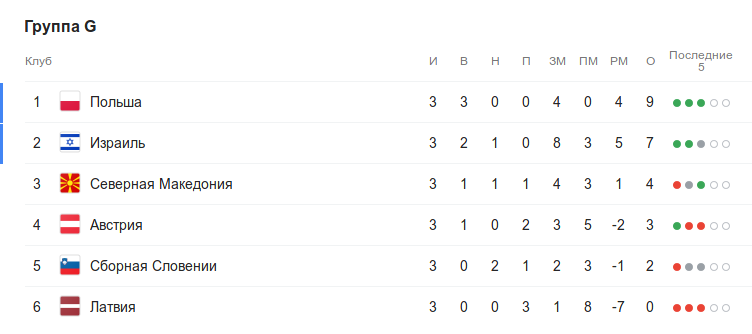 Австрийская сборная, как и северомакедонская, с минимальным счётом уступила польской команде, а затем проиграла 4:2 израильтянам — она начинала прошлый тур на предпоследнем месте в турнирной таблице, но благодаря победе над словенцами оставила позади и их, и латвийцев с 0 очков.