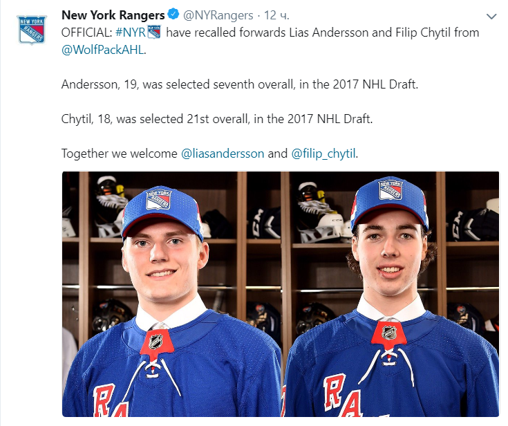 В оставшихся матчах рейнджеры также планируют использовать молодых техничных форвардов, 18-летнего чеха Филипа Читила и 19-летнего шведа Лиаса Андерссона. Вчера они были вызваны из Хартфорда (фарм-клуба Нью-Йорк Рейнджерс).