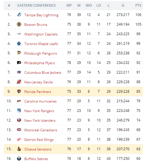 Флорида в последних 27 матчах одержала 20 побед и серьезно включилась в борьбу за плей-офф. Пантеры сейчас сверх мотивированы. Давайте посмотрим в таблицу Восточной конференции и все станет понятно.