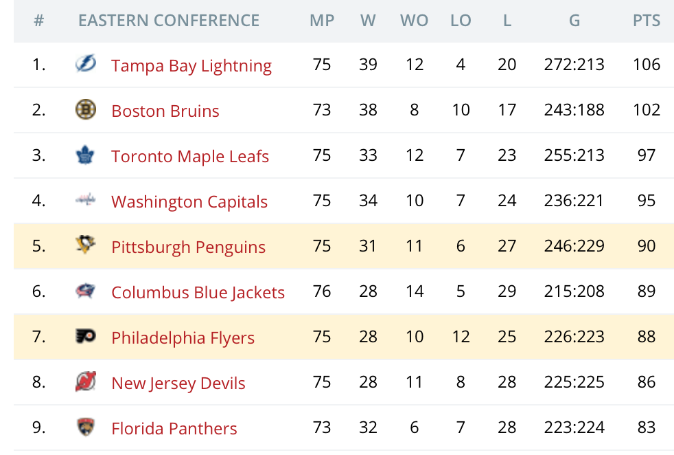 Но Филадельфии необходимо продолжать набирать очки для попадания в плей-офф. Конкуренты совсем рядом. Нью-Джерси отстает на 2 очка, Флорида — на 5. При этом стоит учесть, что у Флориды сыграно на 2 матча меньше. Получается, что по потерянным очкам Флорида отстает всего на 1 очко.