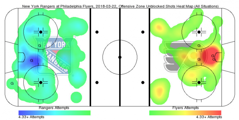 Команды нанесли по 36 бросков в створ. У Филадельфии было 17 бросков из очень опасных зон, когда вероятность гола достаточно велика. У Рейнджерс таких бросков было 13.