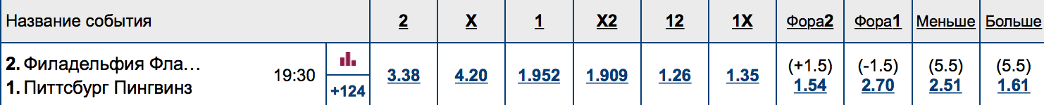 В общем, я склоняюсь к высокой результативности в этом матче. Относительно исхода поставил бы на Питтсбург, они все-таки дома очень мощно играют. С другой стороны Филадельфия сейчас сверх мотивирована борьбой за место в плей-офф. По этой причине считаю, что оптимальной ставкой на матч является индивидуальный тотал Питтсбурга больше 3 за коэффициент 1,66. Как минимум 3 шайбы в этом матче Питтсбург то должен забросить.
