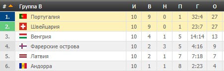 Здесь мы видим Андорру, Фарерские острова и Латвию. Это три соперника с не самым высоким уровнем футбола. В Латвии в рамках футбола наблюдается сильнейший кризис. Единственным крепким соперником по группе была сборная Швейцарии. И вот как раз его португальцам удалось обойти чисто по лучшей разнице забитых и пропущенных голов.