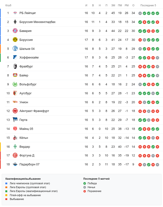 Однако теперь «РБ Лейпциг» — не единоличный лидер. Конечно, если бы сезон закончился по окончании предыдущего тура, команда бы стала чемпионом, но она заработала столько же очков, сколько набрала «Боруссия Мёнхенгладбах», а выше оказалась благодаря большей разнице забитых и пропущенных голов: +26 против +15.