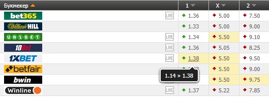 Здесь видно, как в букмекерской конторе 1xbet первоначально на П1 стоял коэффициент 1.14, а под воздействием прогруза он поднялся до 1.38, это очень сильный взлет, что стоит учитывать при прогнозе.
