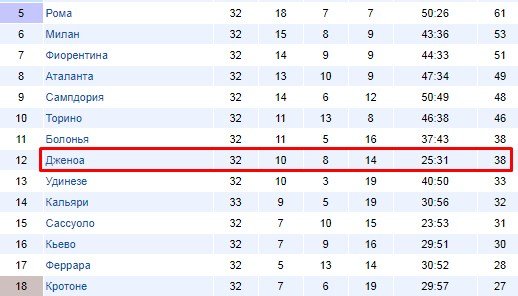 Посмотрите, где в турнирной таблице располагается Дженоа.