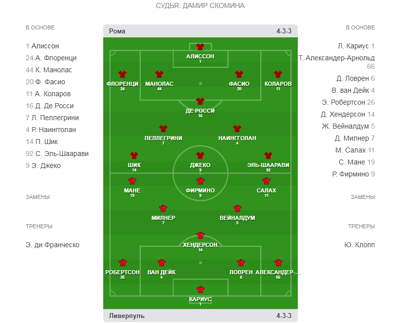 Напомним, что первый полуфинальный матч этой пары завершился с громким счетом 5:2 в пользу мерсисайдцев. Игру решил один человек — Мохамед Салах. На его счету 2 забитых мяча и 2 результативные передачи, а после того как его заменили на Дани Ингза, игра пошла по наклонной и римляне сумели отыграть два мяча. Счастье Клоппа, что ключевая замена не была проведена раньше.