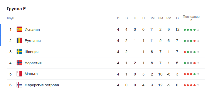 Испанская команда лидирует в группе F, хотя и до того, как заняла первое место в турнирной таблице, считалась фаворитом на выход в финальную часть турнира с первой строчки в таблице. Сейчас на её счету 4 матча, 4 победы, 12 очков.