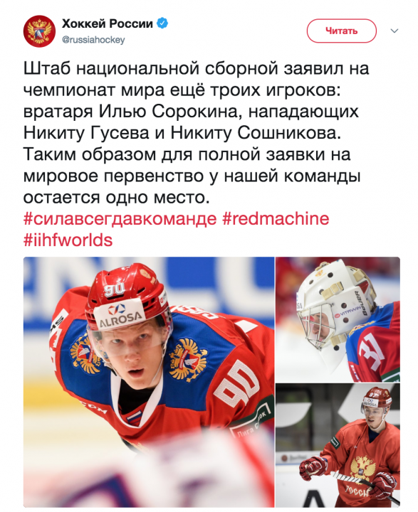 Еще раньше «Тампа Бэй Лайтнинг» выиграла серию у «Бостон Брюинз». Это означает, что Кучерова, Василевского, Сергачева мы тоже не ждем. Так что ситуация с потенциальным усилением энхаэловцами прояснилась. Усилиться не получится. По этой причине были дозаявлены вратарь Илья Сорокин и форварды Никита Гусев и Никита Сошников.
