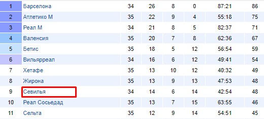 Что мы здесь видим? Что 6-ое место, дающее право напрямую принять участие в групповом этапе Лиги Европы, практически недосягаемо, «желтая субмарина» за оставшиеся четыре тура просто не позволит догнать себя. Но есть возможность зацепиться за 7-ое место, благодаря которому можно сыграть в квалификации Лиги Европы. Но севильцы отстают от этой позиции на три пункта, имея одну игру в запасе.