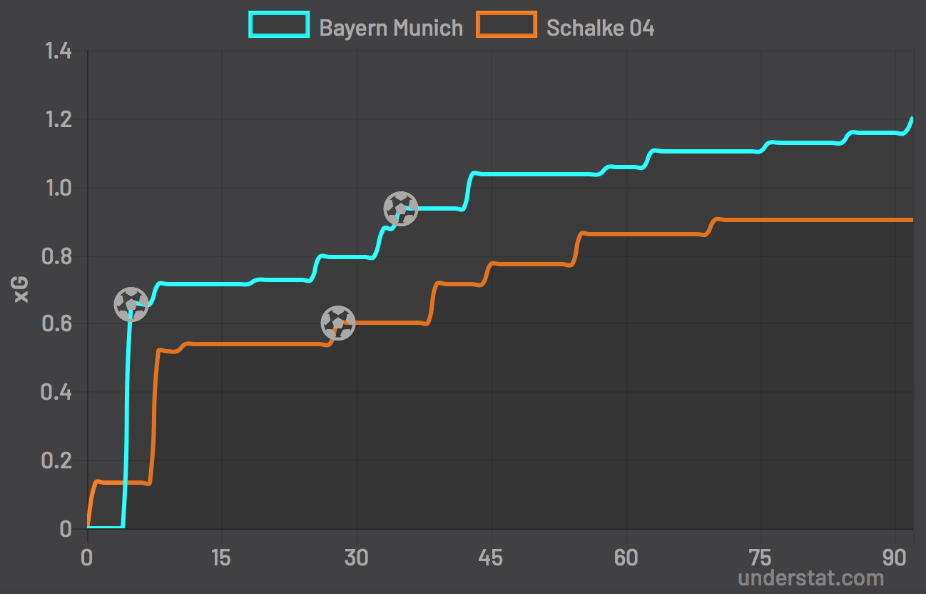 Как видим, Шальке не сильно уступил Баварии по показателю xG и смог остановить Баварию на уровне xG, равным 1,2. Сами показали xG чуть ниже (0,9). Кроме того, в первом тайме было равенство по владению мячом. И это против Баварии, которая обычно имеет этот показатель, уходящий к 70%.
