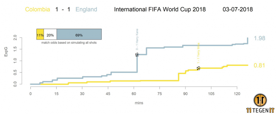 Колумбийцы в ходе всего матча «заводились» и нередко играли откровенно грубо. Видимо, из-за того, что не получалось нормальной игры, они нервничали. После пропущенного гола колумбийцы вообще перестали задумываться как играть в отборе и жестких фолов стало больше. Английские футболисты стали отвечать тем же. Накаливалась обстановка на поле. Колумбийцы при этом старались бежать вперед, быстрее доводить мяч до штрафной площади англичан и на последней минуте матча после розыгрыша углового защитник Мина головой забил очередной свой гол на чемпионате мира. В итоге Англия выиграла по пенальти, но в дополнительное время в первом тайме они позволили перехватить инициативу колумбийцам.
