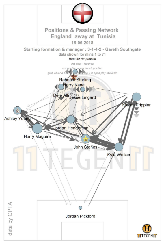 В матче против Туниса примерно такая же была ситуация по xG. Моменты у англичан были, в атаке мысль есть и ходы к воротам находить удается. Давайте также посмотрим на карту передач в игре против Туниса.