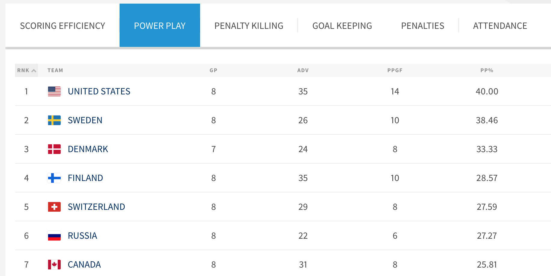 Сборная США является лучшей командой чемпионата по игре в большинстве с фантастическим процентом его реализации — 40%.
