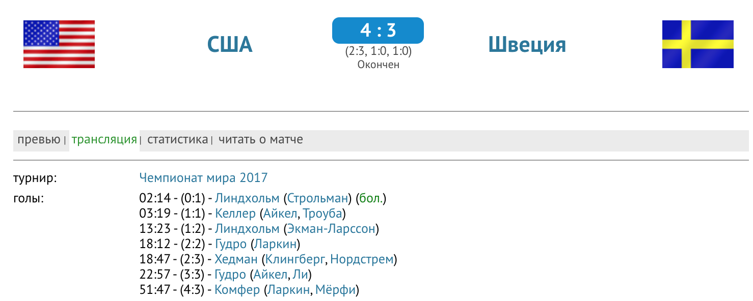У сборной Швеции, также как и на этом чемпионате, был очень сильный состав и они в итоге стали чемпионами мира, но в личной встрече американцам они проиграли. Джони Гудро сделал дубль в том матче. Ну что, посмотрим, сможет ли Гудро в этом сезоне огорчить шведов.