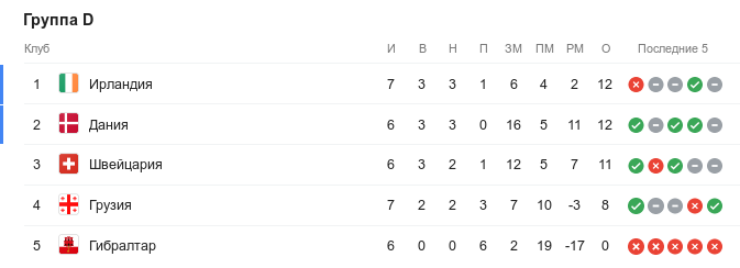 Грузинская национальная команда точно не попадёт на Чемпионат Европы напрямую, хотя отстаёт от лидеров группы всего на 4 очка. В отличие от швейцарцев, грузинам осталось провести всего один матч квалификации — это будет последний.
