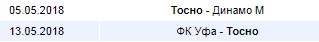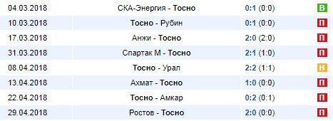 Здесь мы видим, что на конец сезона осталось сыграть с двумя крепкими середняками. В крайнем туре предстоит съездить в гости к «Уфе» и в матче с таким соперником будет крайне сложно набрать хотя бы один балл, так как команда Семака явно в последнем матче у себя дома на родной арене постарается хорошей игрой и победой поблагодарить своих ярых поклонников за поддержку на протяжении всего чемпионата. Проигрыш «Тосно» в этом последнем туре очевиден.