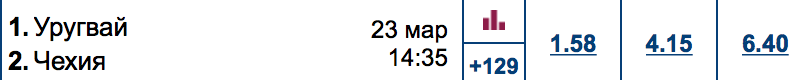 Вроде бы все логично. Уругвай будет играть в финальной части Кубка мира 2018. Чехия пропустил этот праздник футбола. Звезды в составе Уругвая Суарес и Кавани несомненно вносят свой вклад в формирование коэффициентов. Ну и на кого будет ставить среднестатистический клиент букмекерских контор. Естественно, на Суареса с Кавани. Видимо, это ожидание и представление букмекеров коэффициент на победу Уругвая немного понизил заведомо.