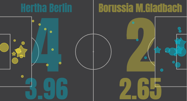 В матче прошлого тура против «Боруссии» из Менхенгладбаха получилась феерическая игра и по счету и по содержанию. Обе команды закончили матч с высокими показателями потенциальных голов, а у «Герты» он вообще дошел до значения 3.96. Подобные значения не всегда бывают у «Баварии» в матчах против аутсайдеров.