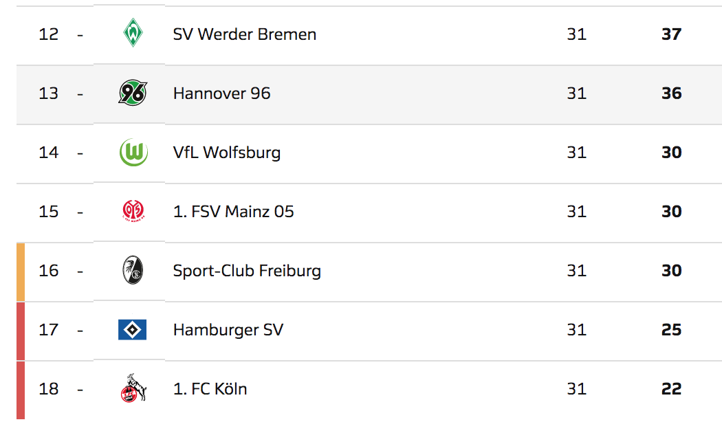 «Ганновер» занимает 13-е место и имеет неплохой отрыв от зоны вылет, который составляет 6 очков. Учитывая, что в Бундеслиге осталось сыграть всего 3 тура, преимущество солидное. Правда, теоретическая возможность попадания в зону вылета все еще имеется.