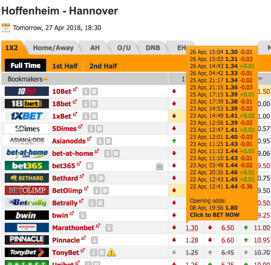 «Марафон» вышел с линией 1,44 на победу «Хоффенхайма» и начиная с 23-го апреля коэффициенты падает, и на данный момент составляет 1,3. Учитывая, насколько мощно сейчас выглядит «Хоффенхайм» и их высокую мотивацию, вызванную борьбой за зону Лиги чемпионов, вполне объяснима такая динамика и столь низкое значение коэффициента.