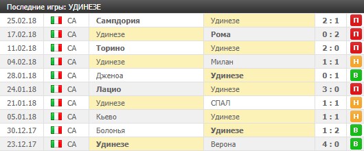 Четко бросается в глаза сильный спад в игре, когда за последние 8 туров была добыта только одна виктория, а из 24 баллов было набрано только 6 пунктов. И ведь поражения сыпались не только от лидеров, но и от не самых серьезных оппонентов. Обращает на себя внимание крупный проигрыш в гостях у Лацио. А приехавшая в гости Рома также праздновала сухую викторию со счетом 0:2. Мы с вами видим, что Удинезе никак не может сдержать мощную атаку лидеров и забить тем хотя бы один гол также не получается.