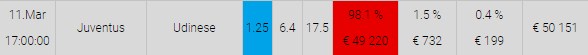 Видите, на момент написания статьи уже было поставлено 50 тыс. долларов на этот поединок и 98% из них было поставлено на Ювентус.