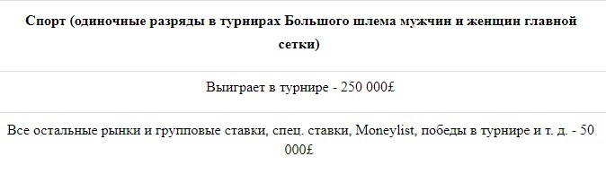 Вот и получается, что пользователи, в основном играющие в рамках, например, баскетбола или другого вида спорта кроме футбола, должны внимательно изучать правила. А вот те, кто ставит только в рамках спорта №1, могут просто смотреть предел максимального выигрыша, футбол в этом плане всегда находится в приоритете. Мы с вами помним наш первый скрин, где отмечалось, что в рамках футбола в Вильямм Хилле можно выиграть 2 млн. фунтов стерлингов, а вот сколько можно в этой же конторе выиграть в рамках тенниса.